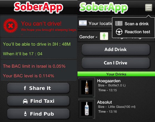 2. Sober App / Drive Sober, האם אני שתוי מכדי לנהוג?יש מדינות או גילאים שאינם מאפשרים ישיבה מאחורי ההגה גם אם יש קמצוץ קטן של אלכוהול בדם. אבל ברוב המדינות ישנו מינון, אחוז אלכוהול בדם, שעד אליו הנהיגה חוקית. אפליקצייתSober App של אנדרואיד ו-Drive Sober של אייפון ואנדרואיד מאפשרות לנו להעריך את רמת האלכוהול בדם לפי המגדר, המשקל, כמות ושעת השתייה, ולדווח אם מותר לנו לנהוג או שלא. אם אסור – נוכל לחפש מונית באמצעות האפליקציה. Drive Sober מוגבלת מעט כי היא פועלת לפי חוקים אמריקאים, אבל מציעה משחק רולטה משעשע שקובע מי מהחבר'ה לא ישתה כדי שיוכל לנהוג; Sober App מתוחכמת יותר, מאפשרת בחירה מדויקת של סוג המשקה האלכוהולי ששתינו ומודעת לחוקי האלכוהול המקומיים לפי מיקום ה-GPS, כדי לפסוק בהתאם אם מותר לנו לנהוג.